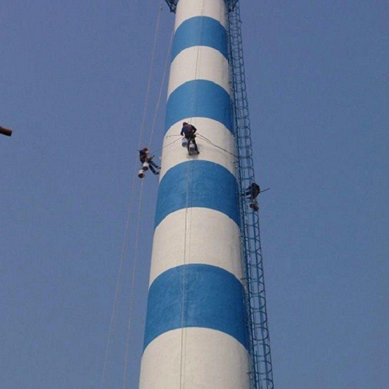 煙囪外壁繪畫防腐:材料為氯磺化聚乙稀高空標(biāo)志專用漆漆,在刷漆前煙囪筒壁先除去浮塵,對(duì)有起鼓的筒壁部分必須用鏟刀或打磨修復(fù)平整,保持筒壁的平整及美觀。其次,對(duì)外壁原色環(huán)及銹漬部位用鋼絲刷打磨和鏟刀鏟除,去掉污垢后;*后再用滾筒人工涂刷氯磺化聚乙稀高空標(biāo)志專用漆。