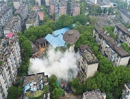 在人口稠密的城市居民區(qū)或繁華街道及各種設(shè)備密集的廠礦區(qū)內(nèi),廢棄的煙囪、水塔等高聳結(jié)構(gòu)物及地震后的高大的危險(xiǎn)建筑物,目前常采用爆破法拆除。爆破拆除法是利用炸藥爆炸破壞建筑物的某一局部,造成建筑物在自重作用下定向倒塌,成就地坍塌。用控制爆破法拆除,能獲得效率高、速度快、費(fèi)用省和安全可靠的顯著效果。